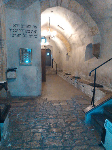 Podlaha je z nerovné historické dlažby. Ze vstupních prostor synagogy je dále přístup přes -2 schody do omezené části hlavních prostor.