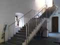 Vstup do východního traktu vpravo v loubí je bez převýšení. Dvoukřídlé dveře (hlavní křídlo šířka 70 cm, vedlejší křídlo šířka 75 cm) se otevírají mechanicky směrem ven a vedou do chodby v přízemí k malému výtahu a schodišti s přístupem do pater.