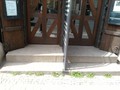 Z nádvoří s kavárnou vedou do budovy dva vchody. Vstup do jižního traktu z nádvoří vlevo je nepřístupný (+2 schody). Dvoukřídlé dveře (hlavní křídlo šířka 79 cm, vedlejší křídlo šířka 85 cm) se otevírají mechanicky směrem ven.