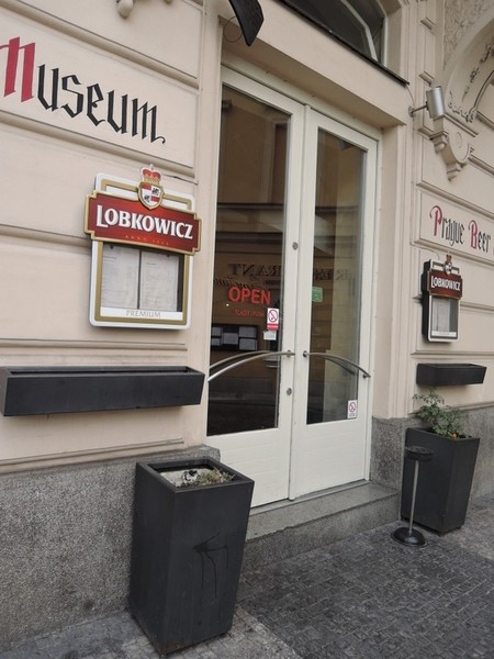 Povrch přístupového chodníku tvoří hrubší mozaika s příčným (až 5 %) i podélným (až 6 %) sklonem. Dvoukřídlé vstupní dveře (hlavní křídlo šířka 83 cm, vedlejší křídlo šířka 85 cm) s +1 schodem (výška 18-20 cm) se otevírají mechanicky směrem dovnitř. Zvonková signalizace u vstupu není.