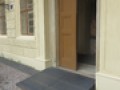 Propojení se Salmovským palácem je ze spojovacího krčku zajištěno rampami umístěnými vlevo od pokladen. První rampa je dvouramenná zalomená (1. úsek sklon 7,8 %, šířka 600 cm, délka 900 cm, 2. úsek sklon 7 %, šířka 180 cm, délka 430 cm). Druhá rampa je přímá (sklon 9,6 %, šířka 180 cm, délka 804 cm). Za rampami následují jednokřídlé dveře (šířka 99 cm), otevírají se mechanicky směrem do průchodu, který klesá (sklon 5,8 %) a následně se opět zvedá (sklon 4,6 %). Z průchodu je přístup vlevo do obchodu se suvenýry přes +1 schod (výška 8 cm) a dvoukřídlé trvale otevřené dveře (průjezd šířka 130 cm). V obchodě je pokladna (výška 66 cm) a výstavní pulty (výška 66 cm a 92 cm). Dále, na dvůr paláce s hlavním vstupem vedou jednokřídlé dveře (šířka 79 cm), otevírají se mechanicky směrem do průchodu. (Dvůr je přístupný také samostatně z Hradčanského náměstí). Povrch dvora tvoří mozaiková a hrubá dlažba. Rampa (sklon 16 %, šířka 160 cm, délka 125 cm) kompenzuje převýšení ve vstupních dveřích, které jsou dvoukřídlé (šířka 2x 80 cm), otevírají se mechanicky směrem dovnitř.