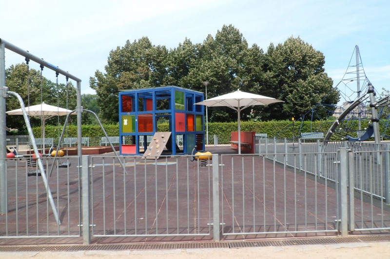 Středový prostor u správcovského domku (kde je možné si vypůjčit sportovní náčiní) a altán s šachovým stolkem na protější straně jsou chráněné proti dešti i slunci plachtami. Vprostřed parku se také nacházejí veřejné toalety s přístupnou kabinou.
