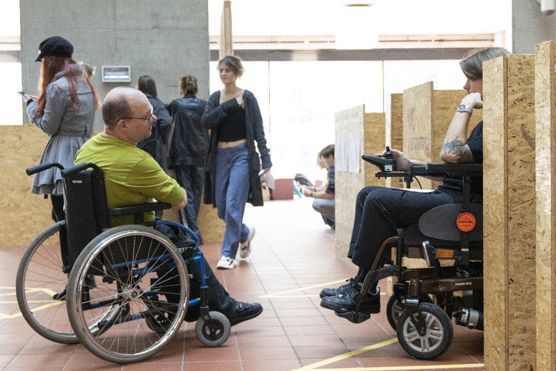 Během konání výstavy si studenti mohli vyzkoušet v simulovaném prostředí různé kompenzační pomůcky.