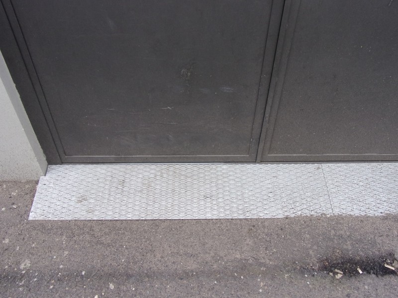 Přístupový chodník má povrch z asfaltu. Vstupní dvoukřídlé dveře (šířka 2x 88 cm) s prudkým vyrovnávacím nájezdem (sklon 30 %, délka 28 cm) se otevírají se mechanicky směrem dovnitř. Zvonková signalizace u dveří není.