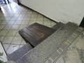 Letní zahrádka ve dvoře je přístupná přes nevyhovující dřevěnou rampu (sklon 27 %, šířka 76 cm, délka 105 cm.