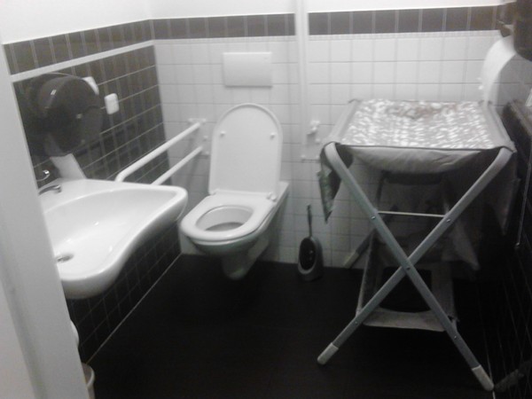 Přístupná toaleta (dveře šířka 90 cm; kabina šířka 164 cm, hloubka 175 cm) je samostatná a nachází se v přízemí. Jednokřídlé dveře do WC jsou označené a otevírají se mechanicky směrem ven. Přístup k míse z pohledu od vstupu do kabiny je zprava. Prostor pro vozík vedle WC mísy je dostatečný (šířka 96 cm). Toaletní mísa je vybavena jedním pevným a jedním sklopným madlem. Manipulační prostor vedle WC mísy blokuje mobilní přebalovací pult.
