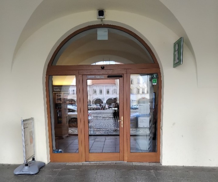 Přístupový chodník má povrch z mozaikové a velkoformátové dlažby bez větších poruch. Jednokřídlé dveře infocentra (šířka 95 cm) se otevírají mechanicky směrem dovnitř.