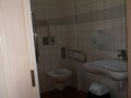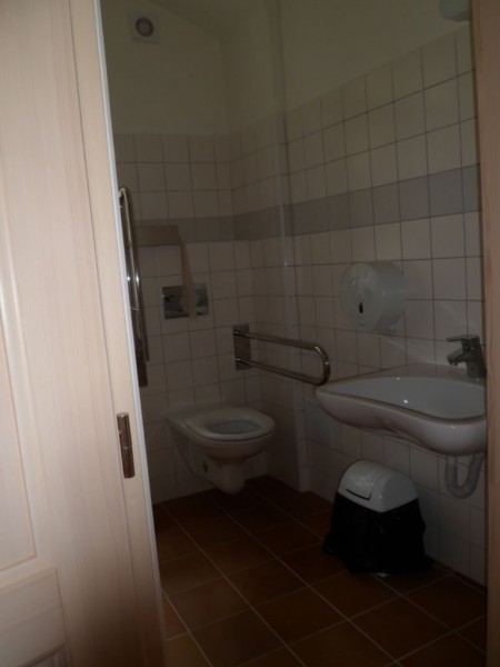 Hygienické zázemí se nachází v chodbě v přízemí. Přístupná samostatná toaleta (dveře šířka 80 cm; kabina šířka 160 cm, hloubka 193 cm) slouží současně jako běžné oddělení WC ženy. Jednokřídlé dveře do kabiny WC jsou označené a otevírají se mechanicky směrem ven. Přístup k míse z pohledu od vstupu do kabiny je zleva. Prostor pro vozík vedle WC mísy je dostatečný (šířka 91 cm). Toaletní mísa je vybavena sklopným a pevným madlem.