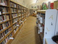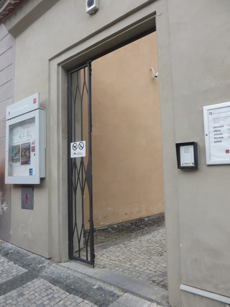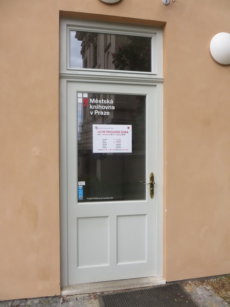 Dlážděný chodník před objektem má kombinovaný příčný (až 8 %) a podélný sklon (4 %). Do knihovny se vstupuje přes zahradu. Kovová brána do zahrady je dvoukřídlá (hlavní křídlo šířka 100 cm, vedlejší křídlo šířka 48 cm) a otevírá se mechanicky směrem dovnitř. Zvonková signalizace s obousměrnou komunikací (výška 129 cm) je umístěna vpravo u brány. Zahradou vede k hlavnímu vchodu do knihovny dlážděný chodník ve sklonu (až 9 %) v délce 30 m.