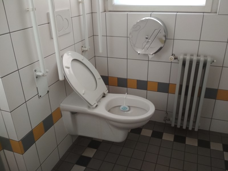 Částečně přístupná toaleta (dveře šířka 80 cm; kabina šířka 150 cm, hloubka 152 cm) je součástí oddělení WC ženy a nachází se v 1. patře. Jednokřídlé dveře do WC jsou označené a otevírají se mechanicky směrem ven. Přístup k míse z pohledu od vstupu do kabiny je vždy zleva. Prostor pro vozík vedle WC mísy je dostatečný (šířka min. 80 cm). Toaletní mísa je vybavena dvěma sklopnými madly.