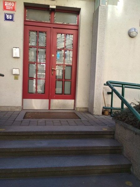 Do předzahrádky objektu se vstupuje dvoukřídlou kovovou bránou (šířka 2x 88 cm), která se otevírá mechanicky směrem dovnitř. Pro kompenzaci schodiště (+ 4 schody) je před vstupem k dispozici zalomená dvouramenná rampa (1. úsek sklon 5%, šířka 124 cm, délka 430 cm; 2. úsek sklon 7%, šířka 124 cm, délka 350 cm). Rampa je opatřena oboustranným madlem (výška 86 cm). Manipulační prostor nad rampou je dostatečný. Hlavní vstupní dveře objektu jsou dvoukřídlé (šířka 2x 70 cm) a otevírají se mechanicky směrem ven. Zvonek je umístěn vlevo u dveří (výška 108 cm). Ze zádveří vlevo vedou do interiéru části knihovny pro dospělé čtenáře další dvoukřídlé dveře (šířka 2x 78 cm), které se otevírají mechanicky směrem do zádveří.