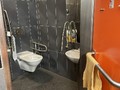 Jednokřídlé dveře do kabiny WC jsou označené a otevírají se mechanicky směrem ven. Přístup k míse z pohledu od vstupu do kabiny je zleva. Prostor pro vozík vedle WC mísy má dostatečnou šířku (šířka 100 cm), hloubka může být limitovaná sklopným přebalovacím pultem kotveným na zadní stěně. U toaletní mísy jsou dvě sklopná madla. Madlo u zdi je krátké (délka 59 cm).