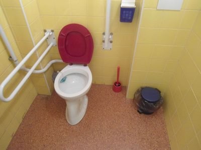 Částečně přístupná toaleta (dveře šířka 84 cm, kabina šířka 146 cm, hloubka 140 cm) je samostatná a nachází se v 1. patře domu, kde sídlí Tyfloservis a je k dispozici i klientům Tyflocentra a Sjednocené organizace nevidomých a slabozrakých. Toaleta je volně přístupná. Jednokřídlé dveře do WC jsou označené a otevírají se mechanicky směrem do strany. Přístup k míse z pohledu od vstupu do kabiny je zprava. Prostor pro vozík vedle WC mísy je zúžený (šířka 77 cm). Toaletní mísa je vybavena dvěma sklopnými madly.