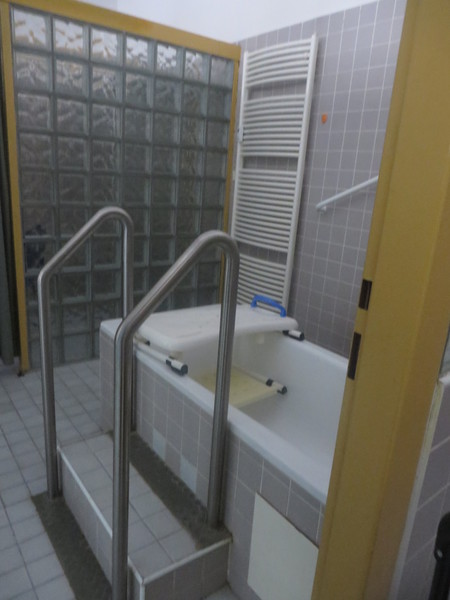 V přízemí objektu se nachází zázemí pečovatelek, jídelna přístupná přes chodbu ve sklonu (sklon 9 %, délka 688 cm) a centrum osobní hygieny vybavené běžnou toaletou, vanou bez zvedacího zařízení a stísněným sprchovým koutem. Manipulační prostor v centru je omezený. V 1. – 3. patře jsou bytové jednotky přístupné jednokřídlými dveřmi (šířka 90 cm). Jednotlivá patra jsou propojena dvěma osobními výtahy, třetí nákladní výtah, který je možné používat pouze v doprovodu pečovatelské služby, propojuje přízemí se suterénem. V suterénu se nachází společenská místnost. Vstup na zahradu je z první schodišťové podesty, která je přístupná šikmou plošinou minimálních rozměrů (nosnost 180 kg; rozměry přepravní plochy šířka 90 cm, hloubka 80 cm). Manipulační prostor v dolní poloze plošiny je nedostatečný.
