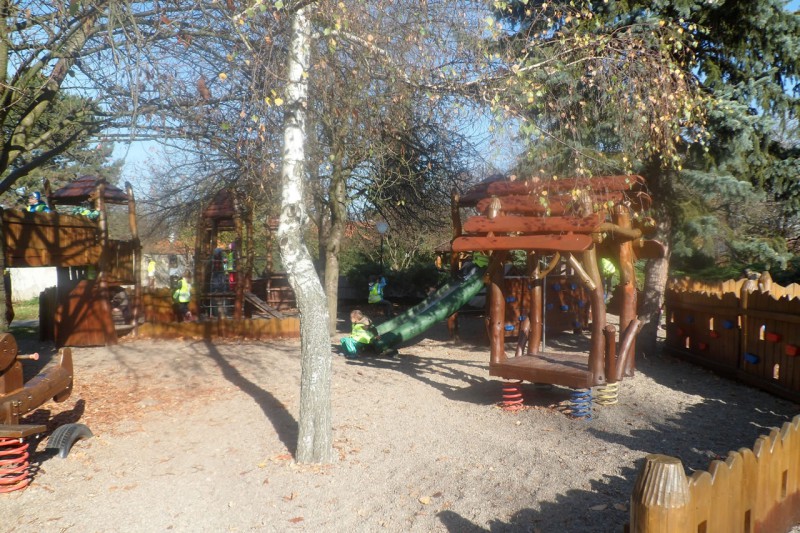 Dětské hřiště v Malé zahradě na pahorku proti rotundě sv. Martina má nápaditou tématiku české mytologie.