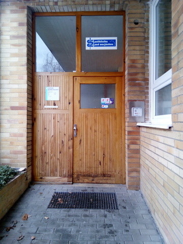 K vstupním dveřím vede přímá jednoramenná rampa (sklon 10 %, šířka 190 cm, délka 750 cm) bez madla. Rampa není zakončena horní podestou a zasahuje až ke dveřím. Vstupní dveře jsou jednokřídlé (šířka 91 cm) a otevírají se mechanicky směrem dovnitř. Zvonková signalizace (výška 132 cm) je umístěna vpravo u dveří.