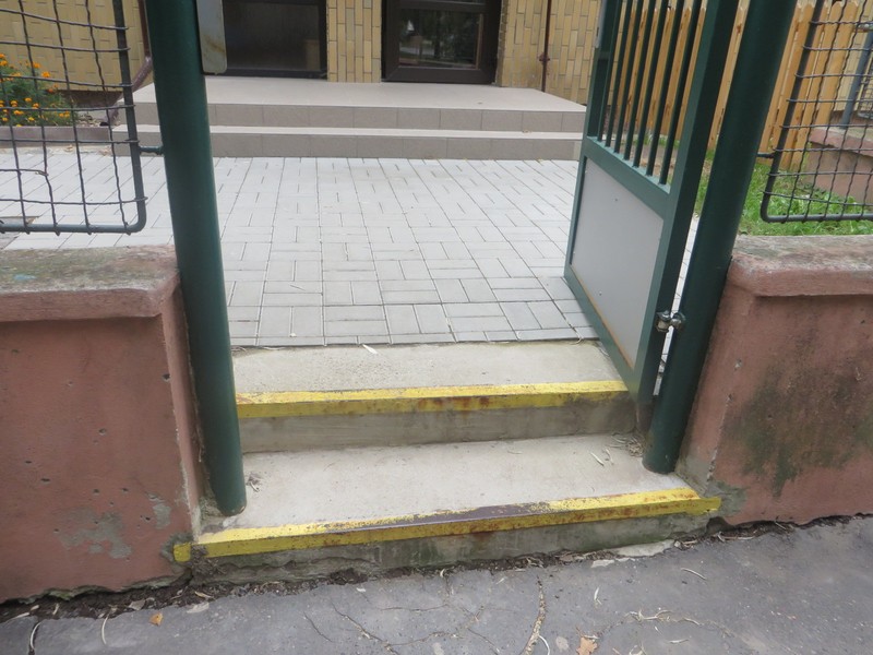 Vstup do areálu MŠ je jednokřídlou brankou (šířka 97 cm), před kterou jsou +2 schody bez možnosti kompenzace.