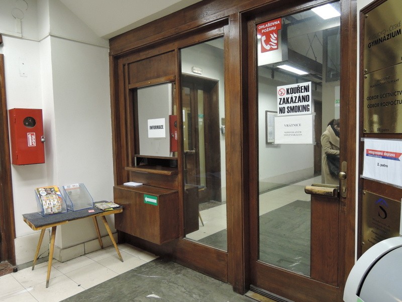Ve vstupní schodišťové hale s výtahem se nachází vrátnice (pult výška 102 cm).