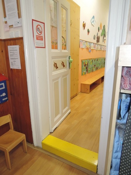 Dvě třídy MŠ se společnou šatnou a jídelnou jsou umístěné v přízemí. Vstupní dveře do tříd jsou dvoukřídlé (šířka 2x 60 cm) s +1 schodem (výška 20 cm). Přístup do tělocvičny je přes -2 a +1 schod domovní schodišťovou chodbou.