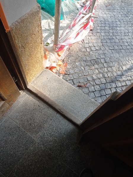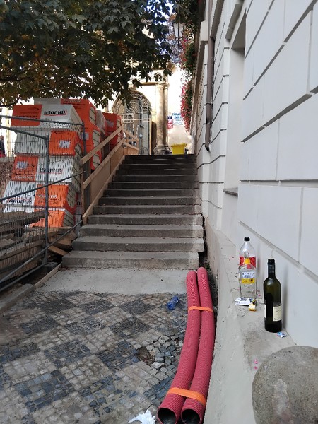 V zádveří je krátké schodiště (+4 schody), které vede do zvýšeného přízemí. Nad schodištěm jsou dvoukřídlé dveře (šířka 2x 77 cm) se zvonkovou signalizací (výška 159 cm).