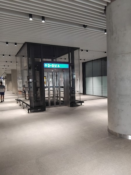 Výtahy (automaticky otevírané dveře šířka 130 cm; kabina šířka 130 cm, hloubka 240 cm) spojují úroveň vestibulu a nástupiště. Manipulační prostor před výtahy je dostatečný. Kabiny jsou vybavené madly (výška 92 cm) na čelní a boční stěně. Zrcadlo v kleci není. Ovladač na nástupních místech je ve výšce max. 106 cm, maximální výška ovladačů uvnitř kabin je 109 cm.