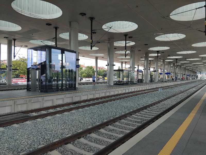 Stanice má dvě vnější a jedno ostrovní nástupiště. Nádražní hala pro cestující s prodejnou jízdenek (pult výška 85 cm), čekárnou a toaletami je pod kolejištěm, v úrovni ulice. Přístup na nástupiště zajišťují eskalátory a výtahy (viz Výtah). Všechny průchody jsou široké min. 80 cm. Manipulační prostor je dostatečný. Šířka nástupišť je min. 210 cm. Výška nástupní hrany je 55 cm. Nástupiště jsou vybavena sedačkami a malými prosklenými čekárnami (dveře šířka 90 cm).