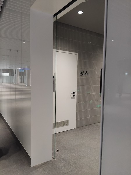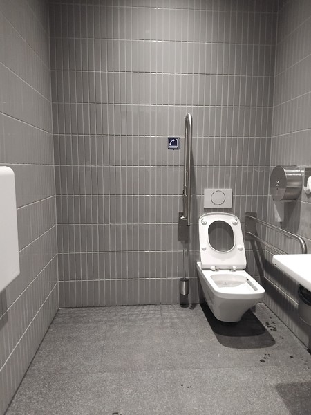 Přístupná kabina WC (dveře šířka 90 cm; kabina šířka 192 cm, hloubka 210 cm) je součástí hygienického zázemí ve veststibulu. Jednokřídlé dveře do WC jsou označené a otevírají se mechanicky směrem ven. Přístup k míse z pohledu od vstupu do kabiny je zleva. Prostor pro vozík vedle WC mísy je dostatečný (šířka 157 cm). Toaletní mísa je vybavena jedním sklopným a jedním pevným madlem. Součástí kabiny je sklopný přebalovací pult.