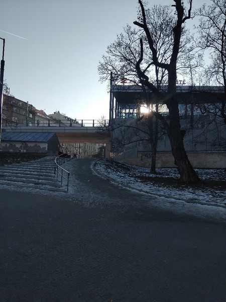 Druhý přístupový chodník lemující schodiště ze severní strany z parku Stromovka má výrazný podélný sklon (13-14 %).