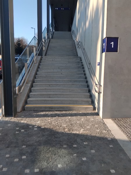 Protilehlá zastřešená nástupiště s rovnou velkoformátovou dlažbou jsou široká min. 200 cm. Výška nástupní hrany je min. 55 cm.