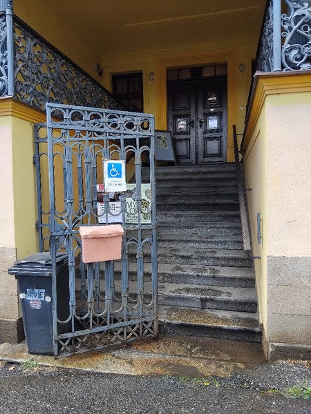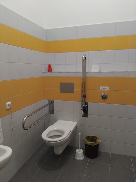 Přístupná toaleta (dveře šířka 80 cm; kabina šířka 169 cm, hloubka 219 cm) je samostatná a nachází se v 1. patře. Neoznačené jednokřídlé kabiny WC se otevírají mechanicky směrem ven. Přístup k míse z pohledu od vstupu do kabiny je zprava. Prostor pro vozík vedle WC mísy je dostatečný (šířka 108 cm). Toaletní mísa je vybavena jedním sklopným a jedním pevným madlem.