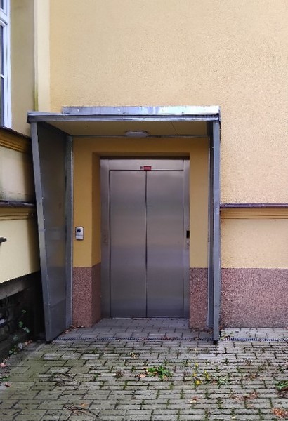 Výtah (automaticky otevírané dveře šířka 100 cm; kabina šířka 160 cm, hloubka 160 cm) spojuje dvůr, přízemí až 2. patro. Manipulační prostor před výtahem je dostatečný. Výtah je průchozí, druhé dveře jsou na boku kabina. Ovladač na nástupních místech je ve výšce max. 106 cm, maximální výška ovladačů uvnitř kabiny je 120 cm.
