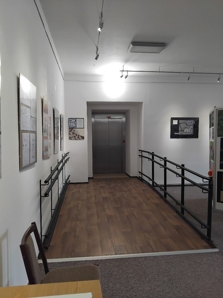 Výstavní prostory se nacházejí ve zvýšeném přízemí a v 1. i 2. patře, která jsou s uliční úrovní propojená výtahem (viz Výtah). Manipulační prostor v interiéru je dostatečný, průchody jsou široké min 80 cm (dvoukřídlé dveře mají otevřená obě křídla). Ve dveřích jsou obvykle prahy (výška max. 3 cm).