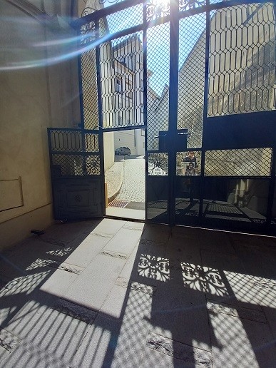Z Hradčanského náměstí vede ke vstupu do galerie prudce se svažující chodník (sklon 10-14%) s hrubou dlažbou. Ve vstupní bráně se otevírají menší jednokřídlé dveře (šířka 93 cm) s vysokou kovovou prahovou lištou (výška 5 cm). Od brány pokračuje směrem k nádvoří průjezd ve výrazném sklonu (sklon 15%, délka 16,5 m) s kamennými protiskluzovými prahy (výška 2 cm). V průjezdu vlevo se nachází pokladna (pult výška 108 cm), vpravo šatna (pult výška 107 cm) a vstup do expozice.