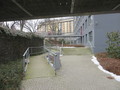 Upravený vchod se nachází z druhé strany domu a je přístupný trojramennou zalomenou rampou (sklon 8 %, šířka 140 cm; délka 1. úsek 457 cm, 2. úsek 255 cm, 3. úsek 460 cm) s oboustranným madlem (výška 97 cm). Dvoukřídlé vstupní dveře se otevírají automaticky do stran. Šířka průjezdu je dostatečná. K dispozici je zvonková signalizace s obousměrnou komunikací (výška 152 cm).