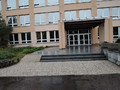 Před hlavním vstupem je krátké schodiště (+3 schody). Nevhodný vyrovnávací nájezd po levé straně schodiště má hrubý povrch a prudký sklon (až 36 %). Dvoje totožné dveře hlavního vstupu do objektu jsou dvoukřídlé (hlavní křídlo šířka 84 cm, vedlejší křídlo šířka 90 cm) a otevírají se mechanicky směrem ven. Zvonková signalizace (výška 139 cm) je umístěna vpravo u dveří nad schodištěm.