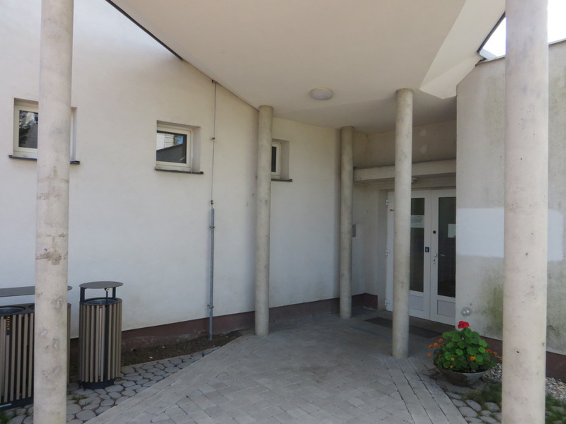 Vstup do objektu je přes komunikaci v podélném sklonu (až 8%). Dvoukřídlé vstupní dveře (hlavní křídlo šířka 90 cm, vedlejší křídlo šířka 65 cm) se otevírají mechanicky směrem ven. Zvonková signalizace s obousměrnou komunikací (výška 145 cm) je umístěna vpravo.