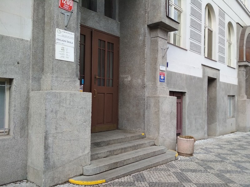 Komunikace v okolí objektu jsou tvořeny převážně mozaikovou dlažbou v mírném podélném sklonu (2 – 4 %). Před vstupem do budovy jsou +4 schody. Zvonková signalizace s obousměrnou komunikací (výška 138 cm) se nachází až nad schody. Dvoukřídlé vstupní dveře (šířka 2x 110 cm) se otevírají mechanicky směrem ven. Za dveřmi je dalších +15 schodů a dvoukřídlé dveře (šířka 2x 110 cm) do zvýšeného přízemí.