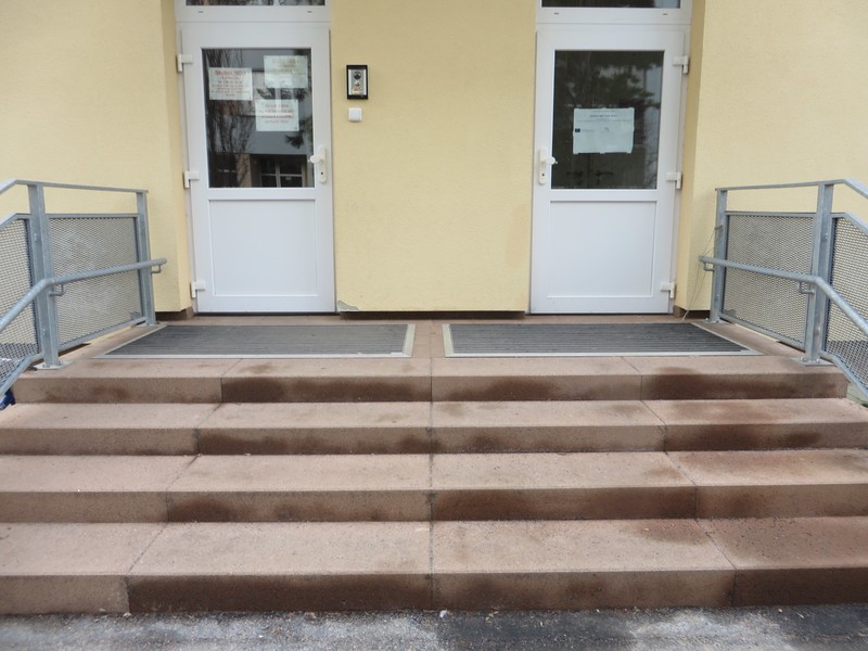 Jižní branka do areálu je jednokřídlá (šířka 96 cm) s pojistkou proti otevření dětmi (výška 161 cm). Za brankou se nachází schodiště (-8 schodů), které lze obejít strmou komunikací (sklon 12 – 15 %). Následují dva upravené vstupy do budovy. Před prvním vstupem je +1 schod (výška 15 cm), který překonává přímá rampa (sklon 12,5 %, šířka 176 cm, délka 161 cm). K dispozici je zvonková signalizace (výška 154 cm) s obousměrnou komunikací. Jednokřídlé vstupní dveře (šířka 90 cm) se otevírají mechanicky směrem ven. Před druhým vstupem jsou +2 schody, které překonává přímá rampa (sklon 11 %, šířka 172 cm, délka 247 cm). K dispozici je zvonková signalizace (výška 155 cm) s obousměrnou komunikací. Jednokřídlé vstupní dveře (šířka 90 cm) se otevírají mechanicky směrem ven.