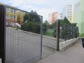 Přístupová cesta k budově školy stoupá v podélném sklonu (sklon 11 %, délka cca 20 m). Před vstupem je k dispozici zvonková signalizace (výška 130 cm) na družinu. Dvoukřídlé vstupní dveře (šířka 2x 80 cm) se otevírají mechanicky směrem ven. Z prostorného zádveří vedou do interiéru další dvoukřídlé dveře (šířka 2x 76 cm), otevírají se mechanicky směrem do zádveří.