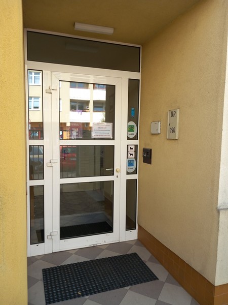 Do budovy vedou celkem 4 vstupy bez převýšení jednokřídlými dveřmi (šířka 85 cm) doplněné zvonkovou signalizací (výška 114 – 137 cm).
