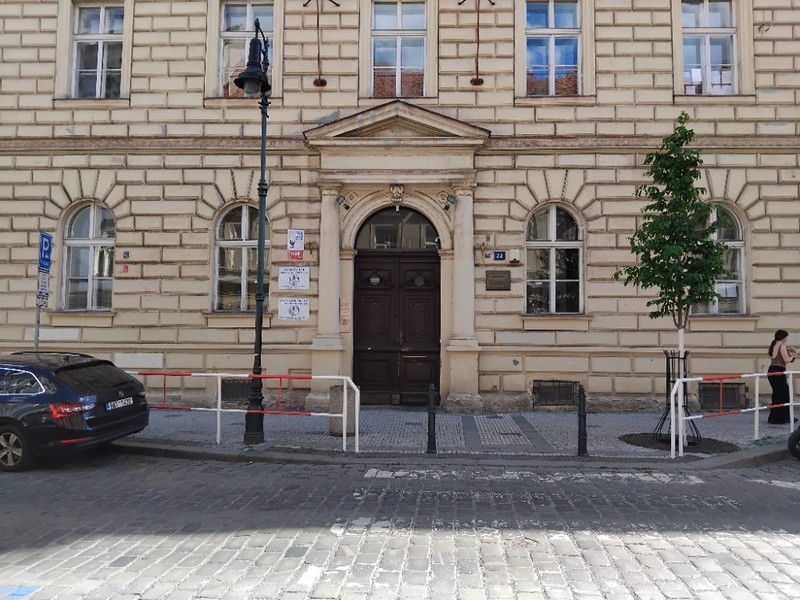 Budova se nachází v historickém centru Prahy, v okolí se často vyskytuje hrubá kamenná dlažba. Chodník před budovou má povrch z rovné mozaikové dlažby. Hlavní vstup je bariérový. Před vstupními dveřmi je +1 schod (výška 6 cm). Dvoukřídlé dveře (šířka 2x 90 cm) se otevírají mechanicky směrem dovnitř. Špatně dostupná zvonková signalizace (výška 157 cm) je až v zádveří (šířka 365 cm, hloubka 289 cm). Ze zádveří vedou do interiéru další dvoukřídlé dveře (šířka 2x 84 cm), za nimiž je schodiště (+8 schodů do zvýšeného přízemí) a druhé schody (+7 schodů) k vrátnici.