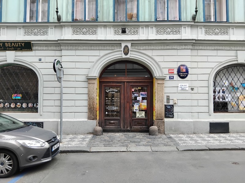Budova se nachází v historickém centru Prahy, v okolí se často vyskytuje hrubá kamenná dlažba. Přístupový chodník má povrch z rovné mozaikové dlažby, plocha před vstupem (vjezd) je ve sklonu (až 6 %) a je dlážděná hrubými kamennými kostkami. Ve dvoukřídlých vratech (šířka 2x 100 cm) jsou vsazeny jednokřídlé dveře (šířka 78 cm) s kovovou prahovou lištou (výška 4 cm). Otevírají se mechanicky směrem dovnitř. Zvonková signalizace u vstupu není.
