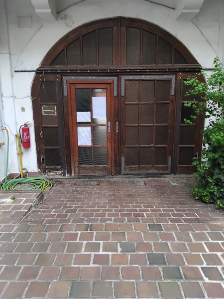 Na vchod navazuje domovní průchod v mírném podélném sklonu (do 4 %) s rovnou velkoformátovou dlažbou. Z průchodu na vnitřní dvůr vedou opět dvoukřídlá vrata (šířka 2x 100 cm) se vsazenými dveřmi (šířka 85 cm) s nižší prahovou lištou (výška 2 cm), otevírají se mechanicky směrem do průjezdu. Za dveřmi ve dvoře je +1 schod (výška 8 cm), na nějž navazuje prudká rampa (sklon 18 %, šířka 242 cm, délka 194 cm) bez madla. Plocha dvora je v rovná dlážděná velkoformátovou dlažbou s širokými spárami (šířka 1,5 cm).