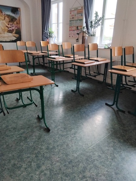 V přízemí školy v úrovni vstupu se nachází pouze sekretariát (dveře šířka 80 cm, práh výška 2 cm) a kaple (dveře šířka 2x 90 cm, práh výška 2 cm), která se zároveň využívá jako aula.