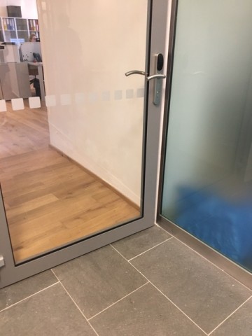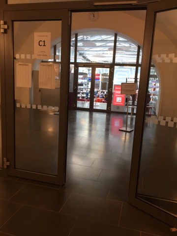 Zádveří je rozdělené prosklenou stěnou s dvoukřídlými dveřmi (šířka 2x 80 cm) na dvě části. Druhá z nich má podlahu ve sklonu (sklon 6 %, délka 460 cm). V tomto prostoru se nachází vrátnice s dvoukřídlými automatickými dveřmi, před kterými je +1 sešikmený schod (výška 4-12 cm).