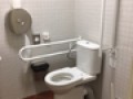 Přístupná toaleta (dveře šířka 90; kabina šířka 186 cm, hloubka 184 cm) v 1. nadzemním podlaží je samostatná. Jednokřídlé dveře do WC jsou označené a otevírají se mechanicky směrem ven. Kabina má otočenou dispozici o 90° (WC mísa je kotvená na pravé boční stěně). Přístup k míse z pohledu od vstupu do kabiny je zprava. Prostor pro vozík vedle WC mísy je dostatečný (šířka 105 cm). Toaletní mísa je vybavena jedním sklopným a jedním pevným madlem.