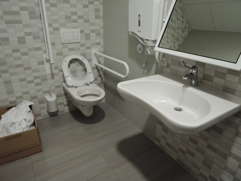 Přístupná toaleta (dveře šířka 90 cm; kabina šířka 179 cm, hloubka 210 cm) je samostatná. Jednokřídlé dveře do WC jsou označené a otevírají se mechanicky směrem ven. Přístup k míse z pohledu od vstupu do kabiny je zleva. Prostor pro vozík vedle WC mísy je dostatečný (šířka 114 cm). Toaletní mísa je vybavena jedním sklopným a jedním pevným madlem.