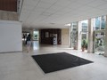 U hlavního vstupu do budovy ze západní strany (dveře šířka 100 cm) je schodiště (+9 schodů). Bezbariérový přístup do objektu je možný zadním vchodem přes atrium, kde je k dispozici jednoramenná rampa (sklon 12,5 - 15 %, šířka 114 cm, délka 556 cm) bez madla, který překonává krátké schodiště (+5 schodů) do atria. Přístupový chodník k zadnímu vstupu je asfaltový s lehkými nerovnostmi, povrch atria pak tvoří rovná velkoformátová dlažba. Dveře zadního vstupu jsou jednokřídlé (šířka 100 cm) a otevírají se směrem ven. Za vstupem se nachází hlavní vstupní hala s centrální vrátnicí (pult výška 75 cm).