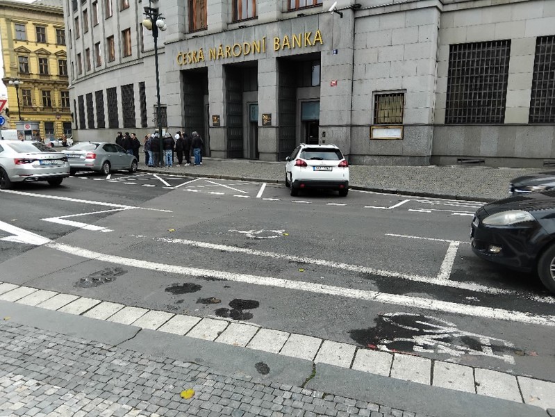 Dvě vyhrazená parkovací stání jsou k dispozici před budovou banky, chodník je opatřen nájezdem.