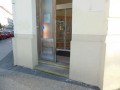 Před vstupem do lékárny jsou +2 schody. Hlavní vstupní dveře objektu jsou dvoukřídlé (šířka 2x 64 cm) a otevírají se mechanicky směrem dovnitř. Zvonková signalizace (výška 117 cm) je umístěna vlevo u dveří nad schody. Ze zádveří (šířka 335 cm, hloubka 164 cm) vedou do interiéru další, automatické, dveře. Šířka průjezdu je dostatečná.